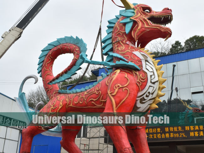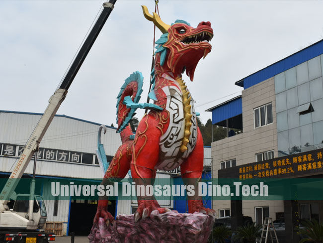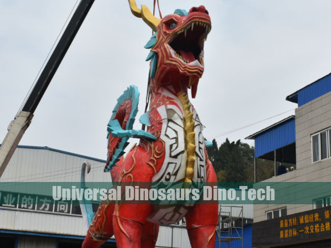 The super-cool huge animatronic Kylin (Chinese Dragon) model was ordered by one client from Beijing ctiy China. Used to decorate his city that never sleeps, the mountains and the sea. The large dragon exhibits brought shock and surprise to the tourists, and its big roaring sound made people tremble all over away from 1000 meters.+Dismantle its wings for shipping