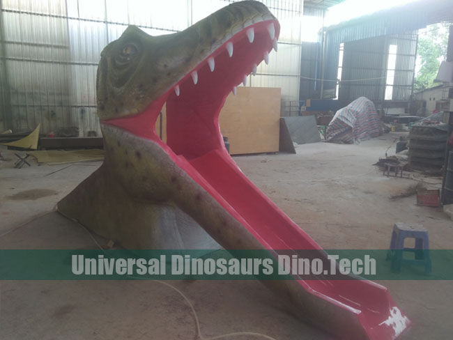 We customized one 3.5 meters long fiberglass dino head slide statue (looked like Trex head shape). The funny dinosaur head slide statue for Liujiao Park. Children could ladder and enjoy sliding fun.