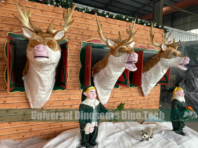 Three animatronics reindeer heads with customized wooden wall as Themed Christmas Decorations. 1.2 meters long animatronics reindeer heads looked pretty. The themed christmas deer decorations for one shopping mall.