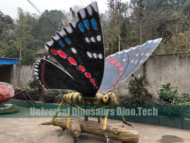 Custom-made 2.5 meters long big robot butterfly model with sound and movement. Selling the animatronic butterfly to Fantaland (kids fun area), Shijiazhuang, China. Its decorated insect exhibits to attract people.
