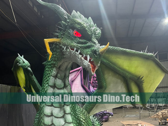 Its 6 meters long manufactured Thunder Green Dragon Model (animatronics model) for water park decorations. It can roar and move as mouth opens, flash eyes light, eyes blink etc. The large green exhibits will be outstanding attraction for water park.